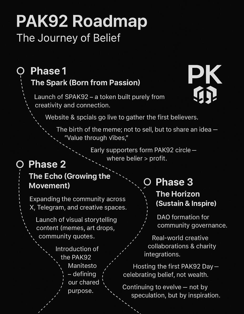 PAK92 has no intrinsic value. It was never meant to. Its worth lies in the people who believe, build, and grow together.Every choice should come from awareness, not impulse. Believe because it feels right — not because it promises return. That’s how meaning stays pure.